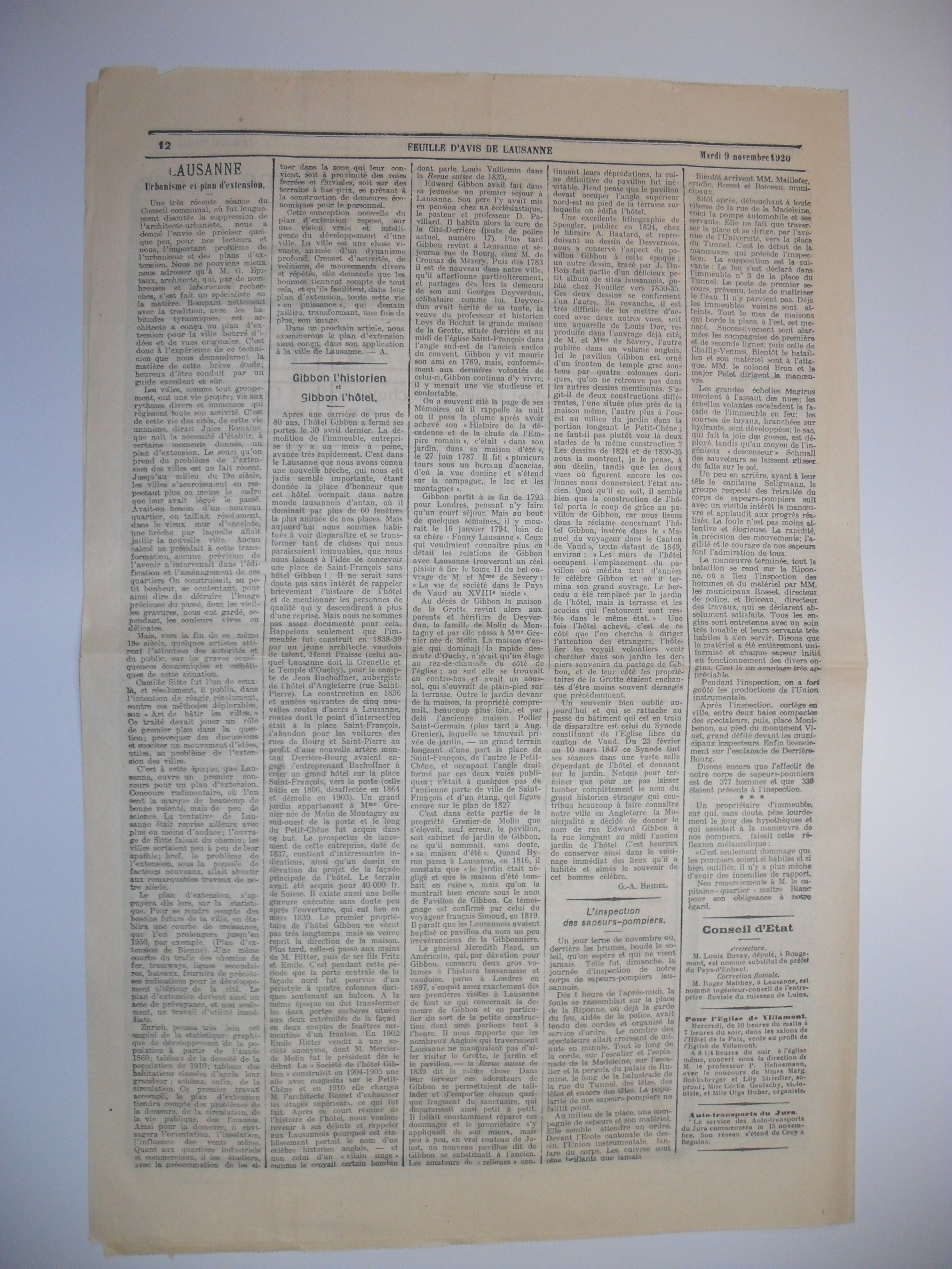 , «Gibbon l'historien et Gibbon l'hôtel», Feuille d'avis de Lausanne, 09 novembre 1920,